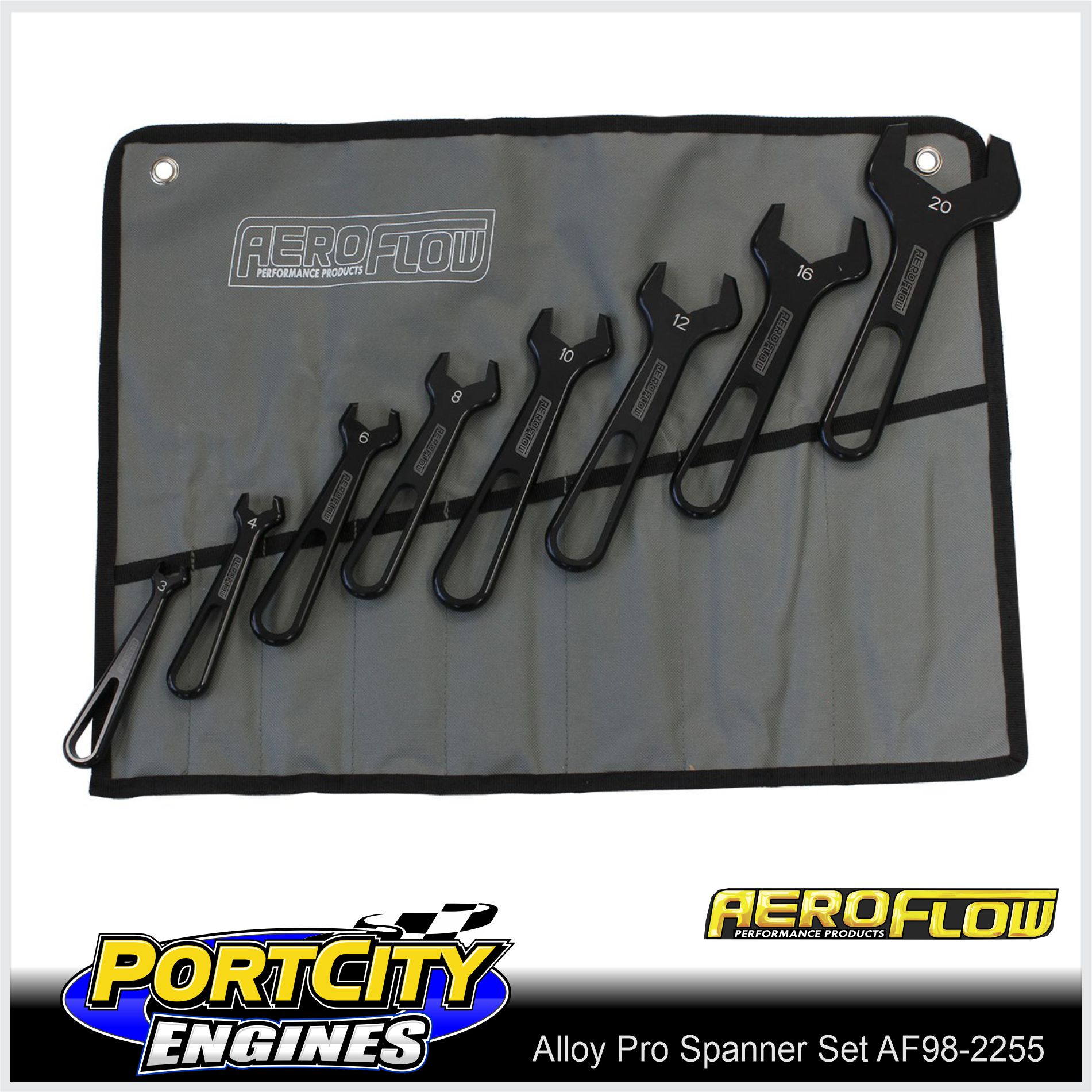 The Aeroflow Pro AN Spanner / Wrench is perfect for all hose end assemblies and adapter fittings, providing a perfect fit so they won’t mark your fittings. They are slimline enough to get into all corners of tight spacers. All aluminium spanners are hard anodized black and size stamped. Being a single ended spanner set they will fit designed to suit B nuts of AN fittings, including 8 sizes from -3AN to -20AN in a 8 piece kit. Recommended to also use in conjunction with the Aeroflow Performance adjustable spanners or vice jaws to install braided hose to fittings. Available in a complete kit with a Pro Spanner roll up bag for protection included or each Pro AN spanner is sold separately as well.